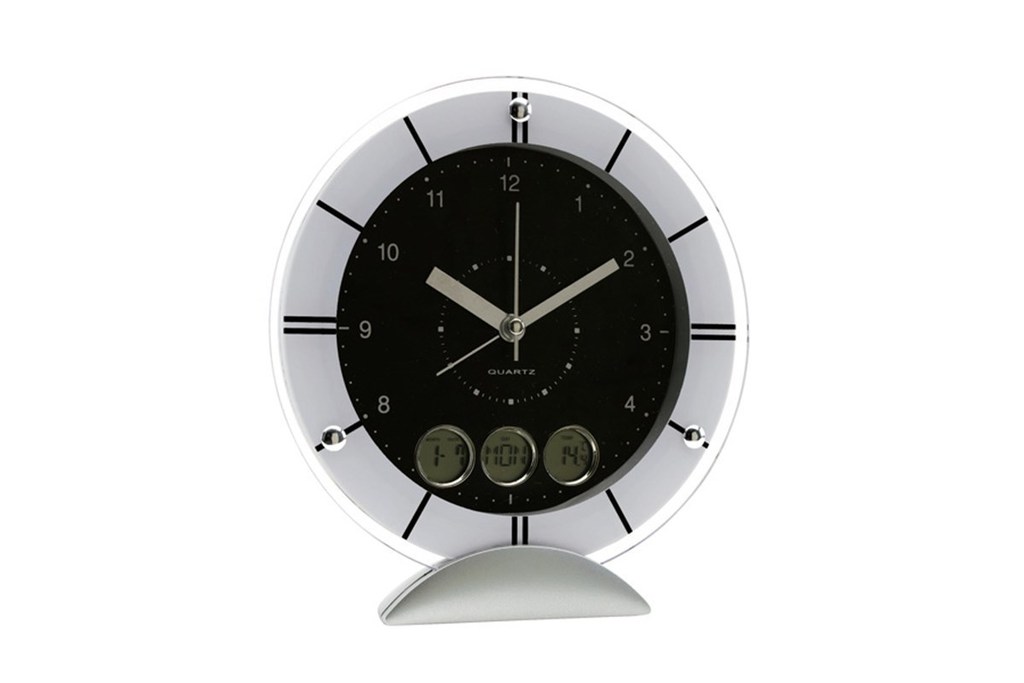 Desk clock "Meteora" with an analogue display, digital date display, calendar and thermometer in 3 round screens, with a silver-coloured stand