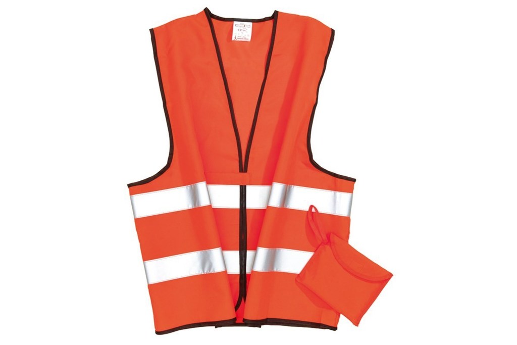 Safety / emergency vest with reflector stripes and Velcro fastener on the front, packed in a bag with carrying handle