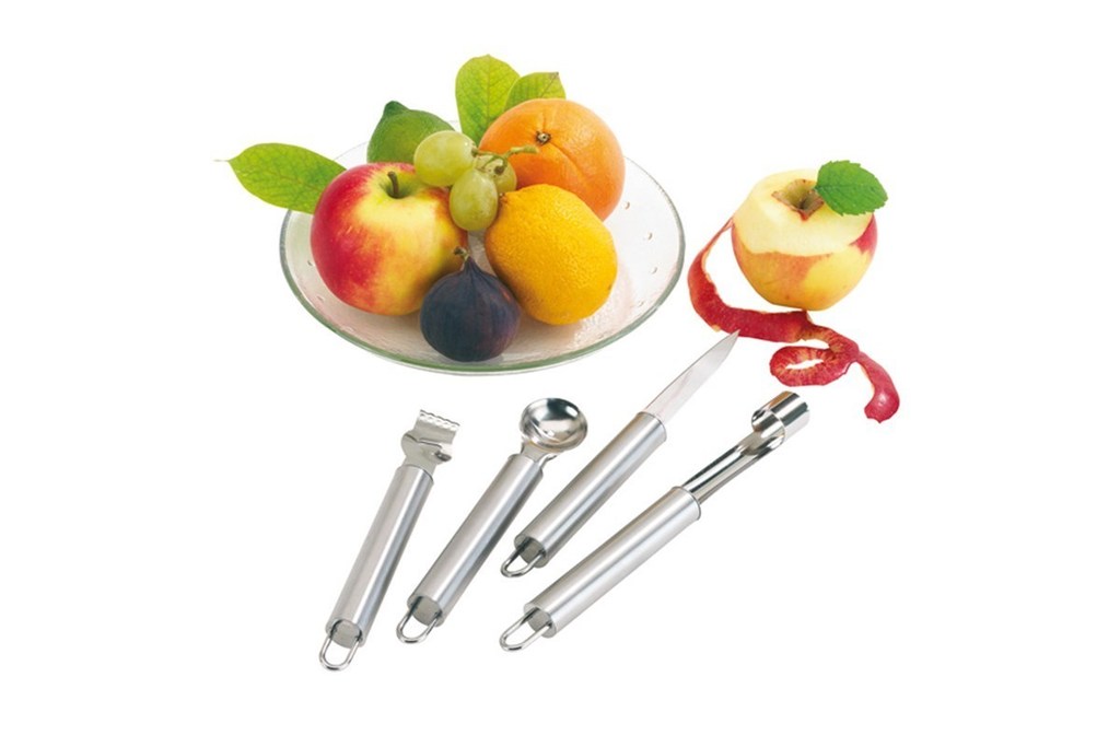 Fruit cutlery set "Fruit" consists of an orange knife, lemon grater, pulp spoon and apple corer, all have a practical loop to hang up