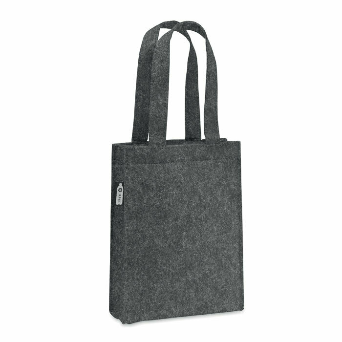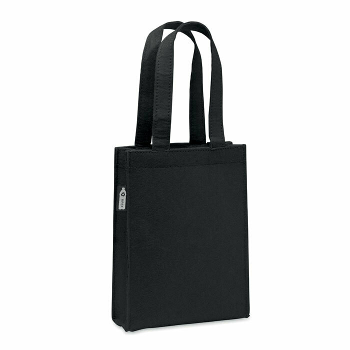 Small RPET felt gift or goodie bag with short handles and bottom gussets. Felt thickness: 1 mm.