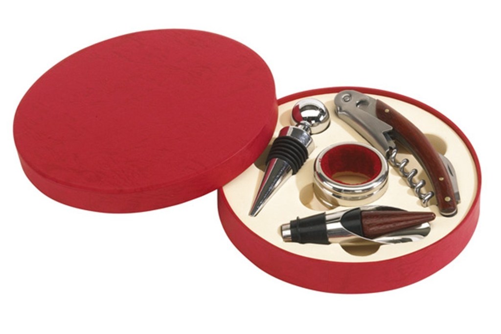 Wine set "Loire" consists of a wooden waiter´s knife, wine ring, bottle stopper and a metal nozzle, packed in a round box